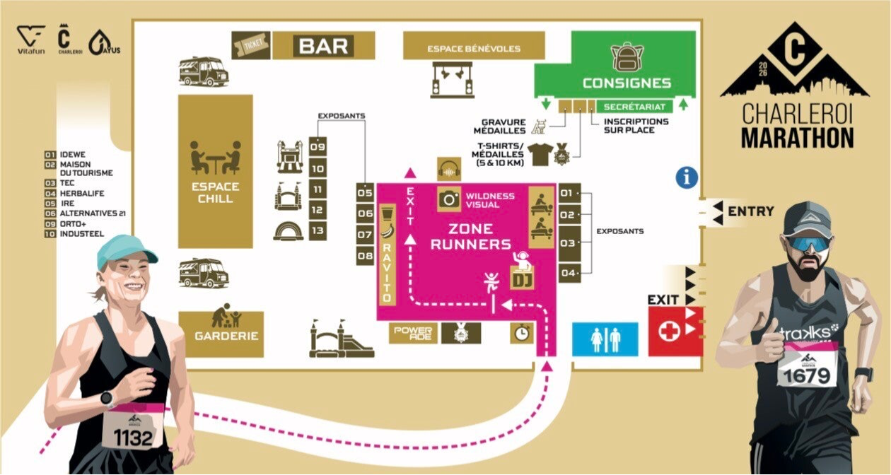Le village marathon se veut convivial, local et festif! en attendant l’arrivée de vos proches, n’hésitez pas à y boire un verre et/ou manger un bout tout en profitant de l’ambiance.